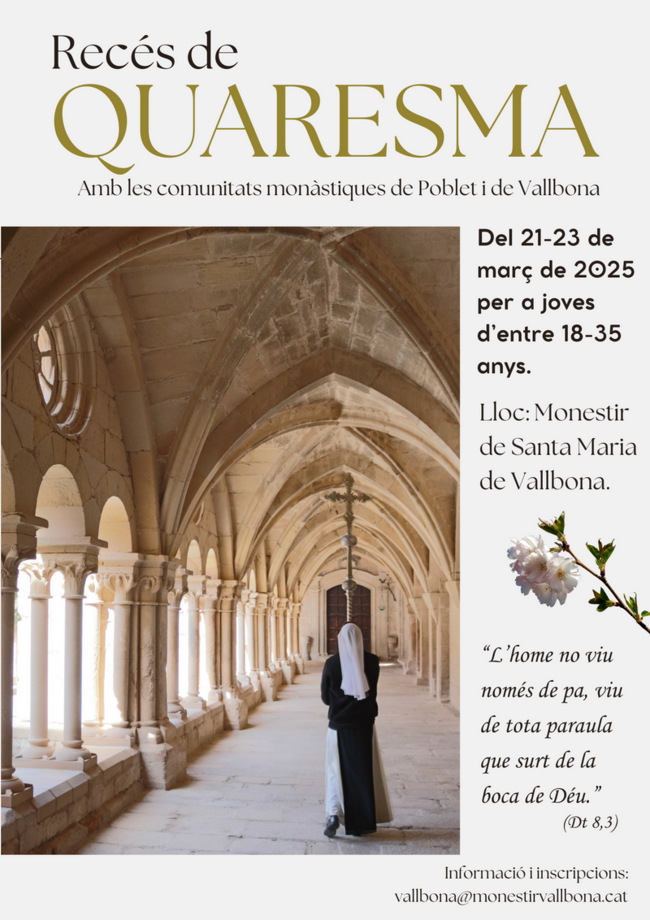 La Quaresma és un temps privilegiat per a la conversió i la purificació del nostre cor en el camí que ens duu a la Pasqua del Senyor. Per això les comunitats monàstiques de Vallbona i de Poblet us proposem fer uns dies de recés espiritual guiats pels elements propis de la nostra tradició.