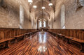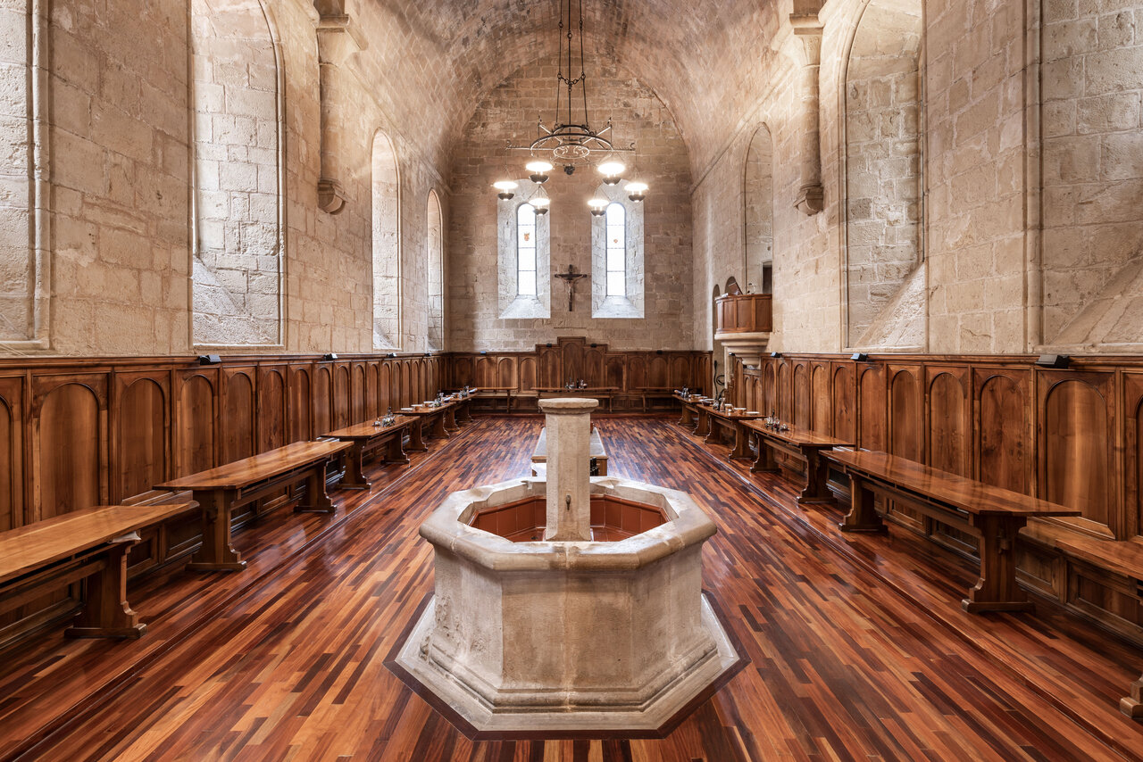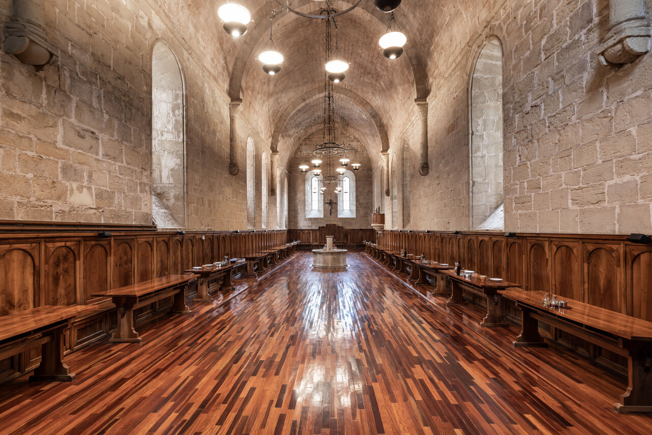 - Per a tot això està pensada aquesta sala solemne, el refetor, del segle XII, una peça molt unitària, amb imposta i volta d’ametlla lleugerament apuntada, amb arcs torals que recolzen en columnes adossades als murs, i aquestes sobre mènsules. Als murs dotze finestrals elegants deixen entrar la llum, bellíssima segons les hores del dia, en aquest espai que recorda l’església, el lloc d’un altre àpat important, l’Eucaristia.