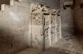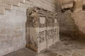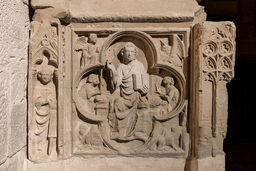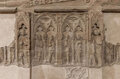 - Aquesta figura, i altres, com les que formen l’apostolat frontal, del qual resten sencers només els apòstols Pere i Pau, Joan i Bartomeu, i les escultures d’àngels, fan pensar en l’obra del mestre anònim d’Anglesola. Es tracta, en tot cas, d’un bell conjunt de figures somrients, d’una gran serenitat i delicadesa formal. Pujant l’escala es pot contemplar la figura jacent, mutilada, del vescomte, amb detalls també de gran preciosisme.