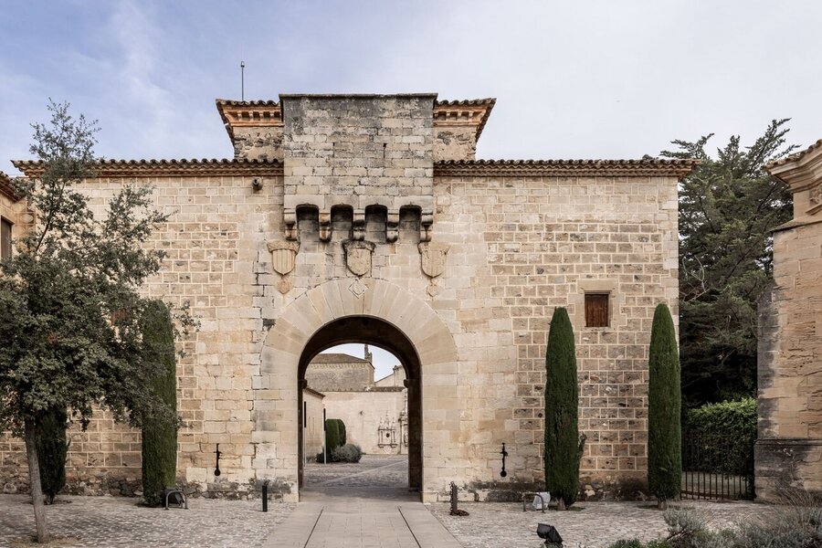 - Junto a la capilla de San Jorge se encuentra la llamada puerta dorada, por la que se accede al segundo recinto, a la gran plaza del monasterio. Al parecer, el nombre le venía de una puerta de bronce —las actuales son de cobre— que se habrían dorado en el s. XVI con motivo de la visita del rey Felipe II. Aquí la comunidad salía a recibir a los huéspedes ilustres. Por la heráldica sabemos que fue construida a finales del s. XV durante los abadiatos de Miguel Delgado (1458-78) y Juan Payo Coello (1480-98), dos de los abades que fueron presidentes de la Generalidad de Cataluña, bajo Juan II y Fernando II.