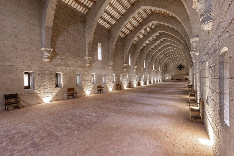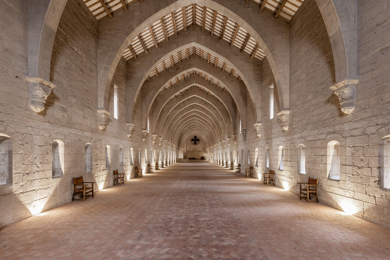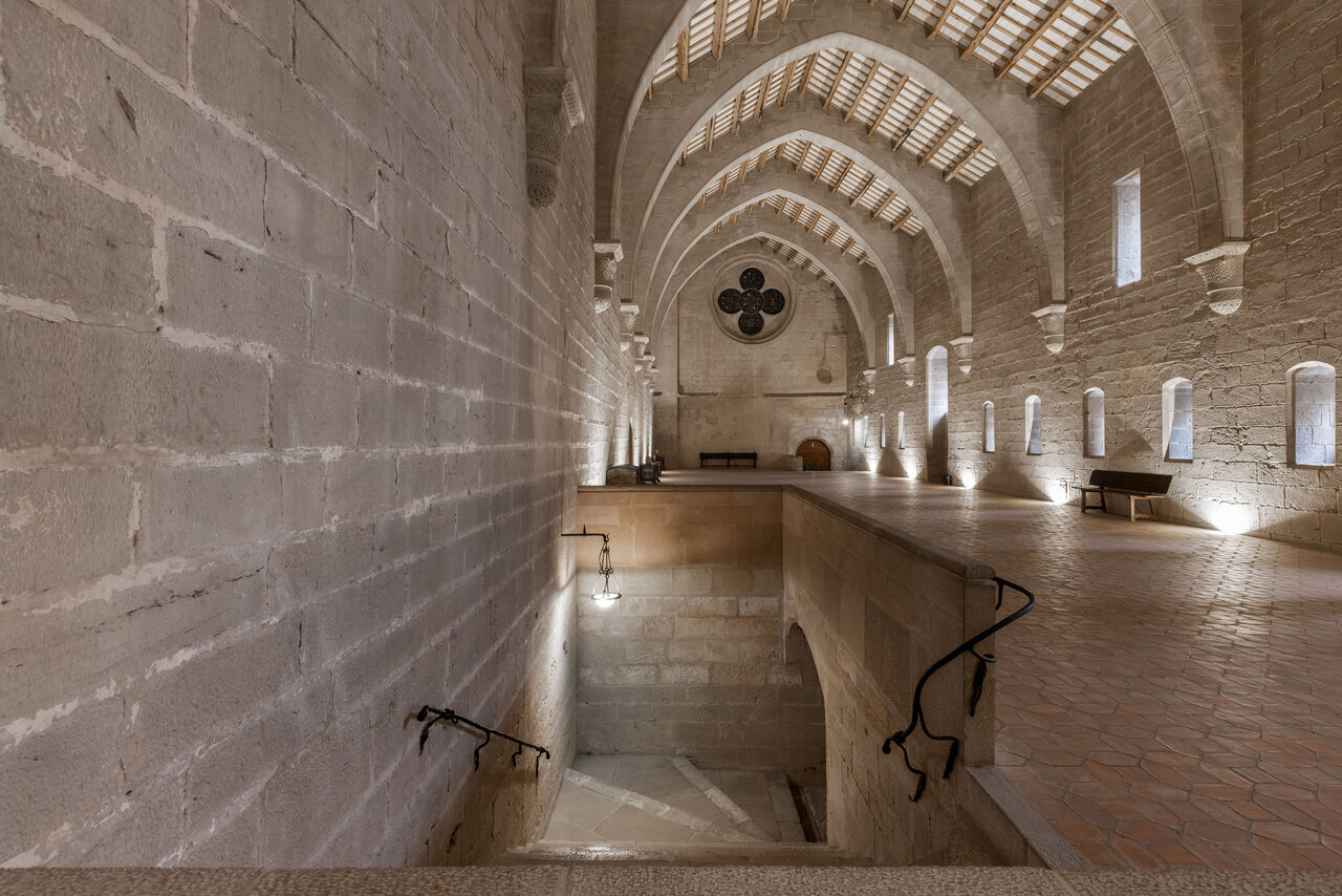 - El dormitorio de Poblet, construido en el siglo XIII, es el primer espacio medieval en Cataluña que sustituye la bóveda de piedra por el tejado de madera y tejas sostenido por diecinueve arcos diafragmáticos, muy elegantes y bien acabados, casi refinados, que descansan en ménsulas trabajadas prodigiosamente por un artesano que se dejó influenciar y maravillar por el arte árabe o mudéjar.