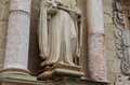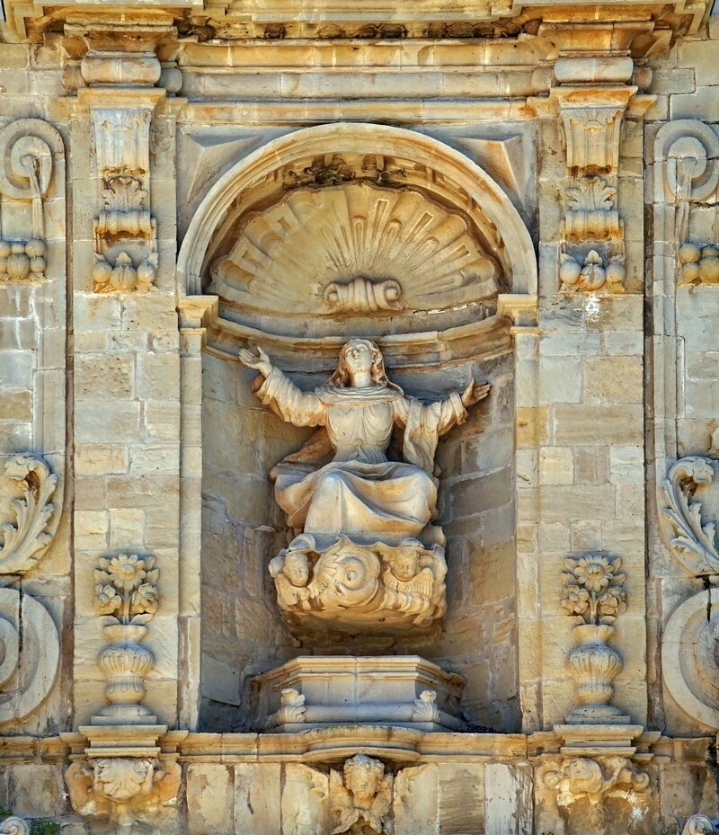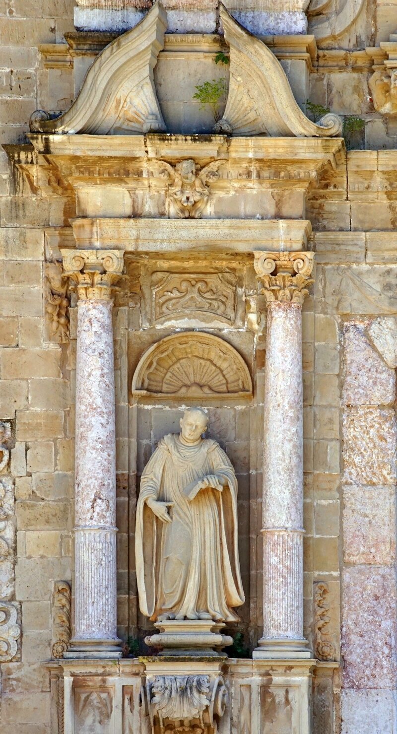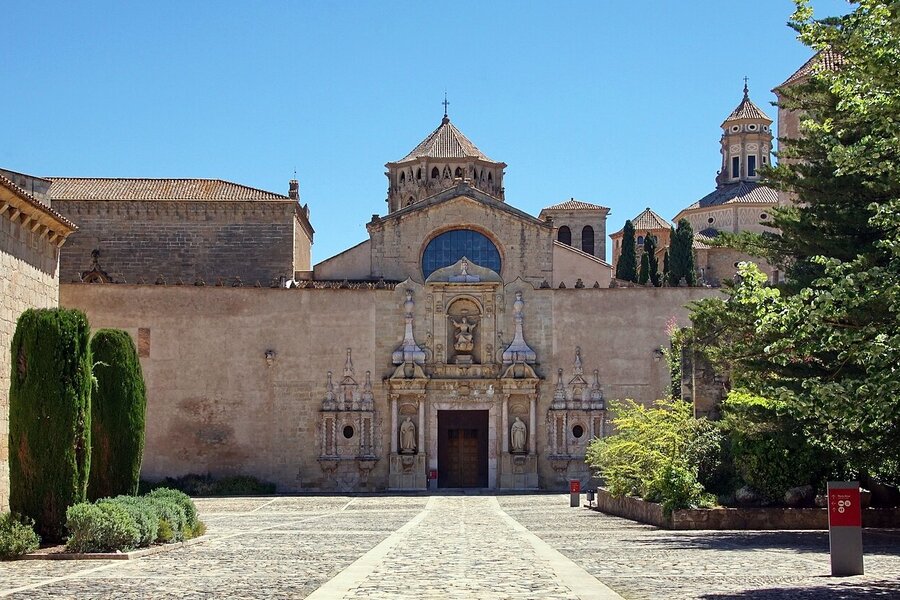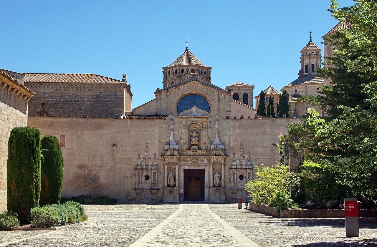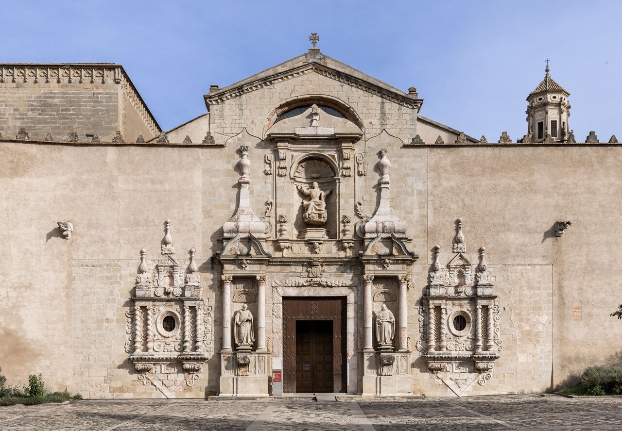 LA PUERTA DE ACCESO AL TEMPLO debía presentar un pobre aspecto en el s. XVII, y el duque Luis Ramón Folch de Cardona y Segorbe, cuyo linaje estaba vinculado al monasterio desde los tiempos fundacionales, y que ya tenía el panteón familiar en el interior del templo, hizo construir una nueva fachada. En conjunto corresponde al cuerpo central de la que todavía se conserva. La construyeron los maestros de obra de Tarragona Francisco Portella y José Llagostera y las tres estatuas son obra de Domingo Rovira, el joven: la Asunción de Santa María, en la parte superior, patrona y titular del monasterio, y san Benito y san Bernardo a ambos lados.