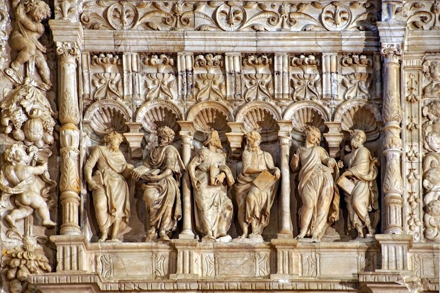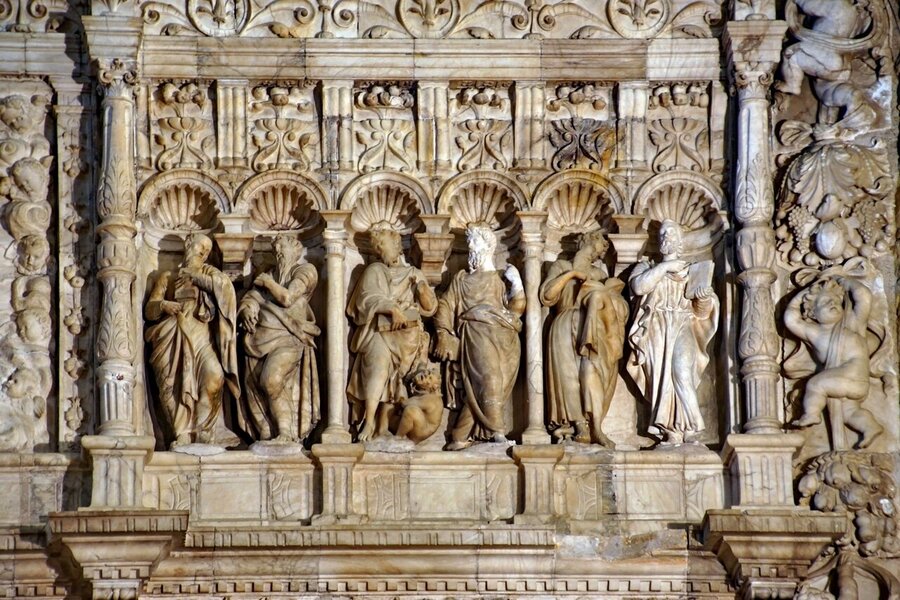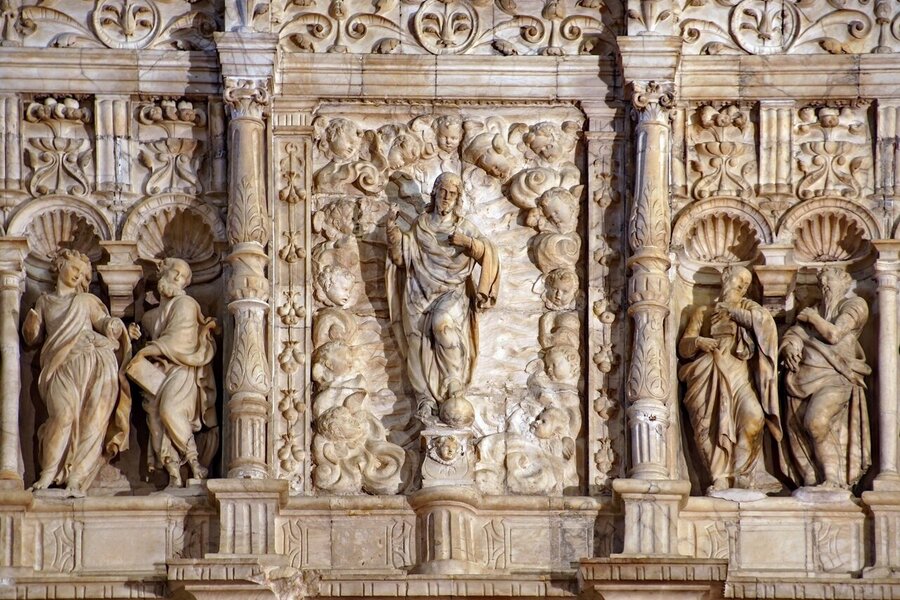 - Esta obra significó la introducción del nuevo gusto artístico —renacimiento— en nuestro país. Está dedicado a la Virgen, que ocupa la hornacina central, rodeada por un grupo de tres santos (Guillermo, Bernardo y Malaquías), a la izquierda, ya la derecha, tres santas (Columbina, Úrsula y Florentina). En la base, muy dañadas, cinco escenas de la Pasión (la oración en el huerto de los Olivos, el arresto de Jesús, Jesús azotado en la columna, el Ecce Homo y el camino del Calvario). Y en la parte superior, los siete gozos de la Virgen (la Anunciación, el Nacimiento de Jesús, la Adoración de los Magos, la Resurrección de Jesús, la Ascensión, Pentecostés y la Dormición de la Virgen María). En el piso superior, los apóstoles con la imagen de Cristo Salvador bendiciendo en el centro. Y en el ático, coronando el retablo, el Calvario.