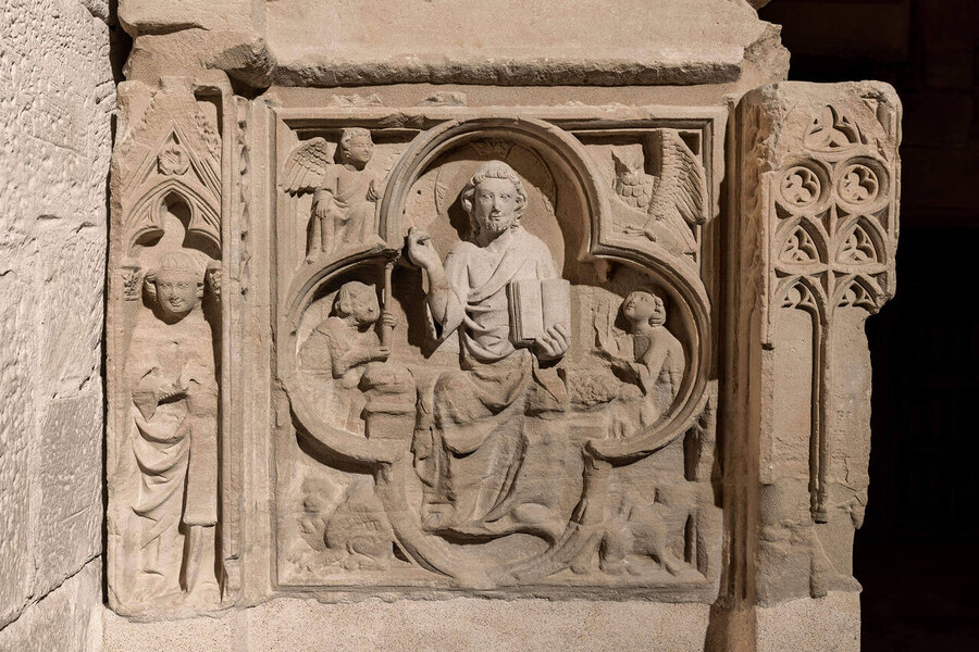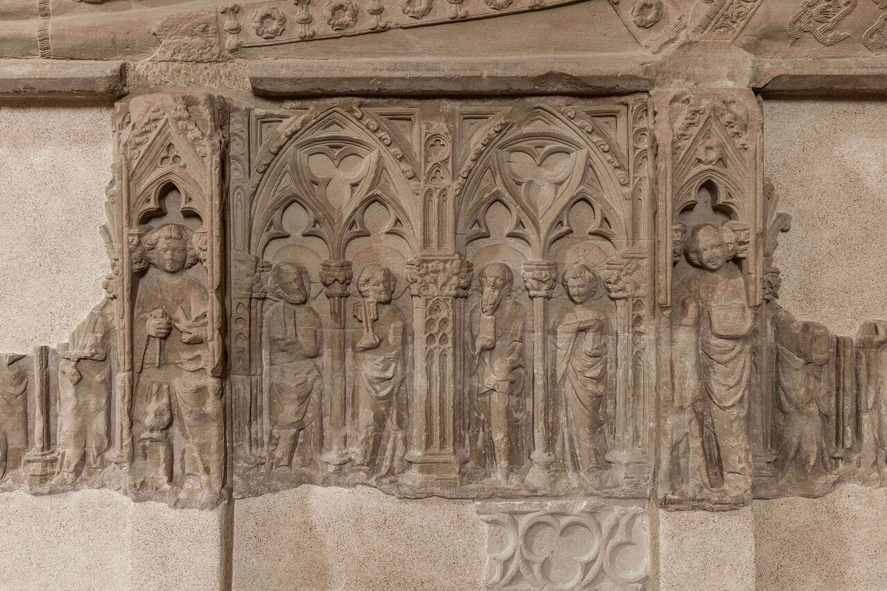 - Esta figura, y otras, como las que forman el apostolado frontal, del cual se conservan enteros sólo los apóstoles Pedro y Pablo, Juan y Bartolomé, y las esculturas de ángeles, recuerdan la obra del maestro anónimo de Anglesola. Se trata de un bello conjunto de figuras sonrientes, de gran serenidad y delicadeza formal. Subiendo la escalera se puede contemplar la figura yacente, mutilada, del vizconde, con detalles también de gran preciosismo.