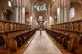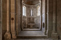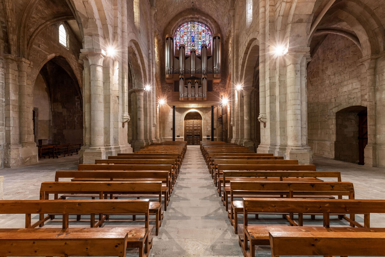 - Il s’agit d’un bâtiment de conception encore romane avec un plan basilical à trois nefs et une voûte en berceau brisé. Comme la plus part des anciennes églises, celle de Poblet est « orientée », c’est-à-dire que son abside est tournée vers l’Est. Voici un signe de profonde spiritualité : les anciens chrétiens priaient tournés vers l’Est, exprimant ainsi leur foi en Jésus-Christ qui doit retourner à la fin des temps pour donner plénitude à l’espérance du monde ; c’est le Seigneur ressuscité, le Soleil venant du ciel, la lumière sans fin et la vie des hommes.