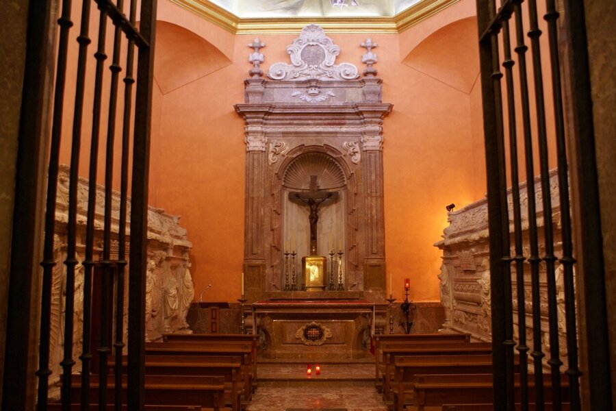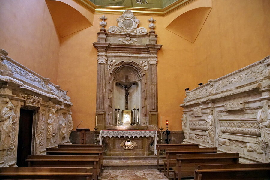 L’ACTUELLE CHAPELLE DU SAINT SACREMENT, dédiée à saint Bernard, a été construite par l’abbé Michel Major (1632-1636) sur le mur méridional de l’abbatiale à la place d’un chapelle médiévale du XIVème siècle qui était dédiée aux apôtres saint Philippe et saint Jacques. Plus tard, en 1685, on y plaça les reliques envoyées par Pierre-Antoine d’Aragon. Finalement, en 1961, elle fut transformée en l’actuelle chapelle du Saint Sacrement. Son autel à été consacré le 21 septembre de la même année.