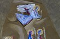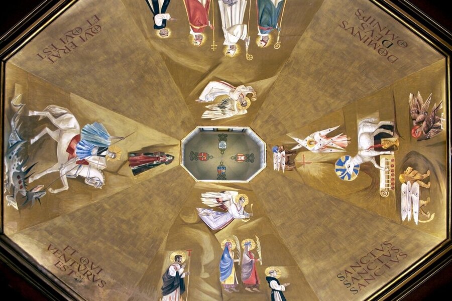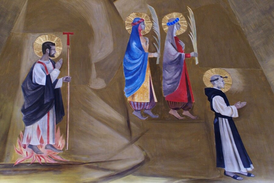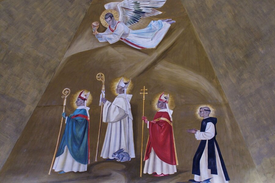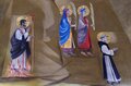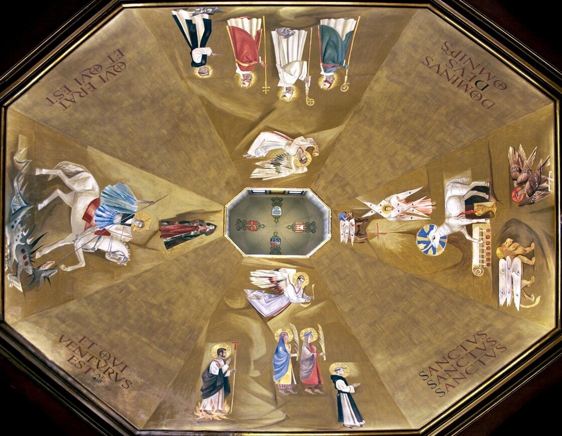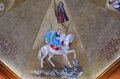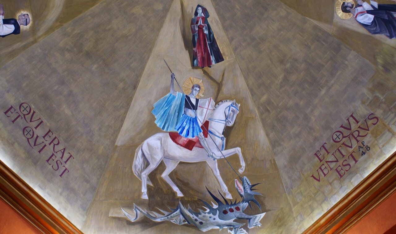 - Entre 1960 et 1961 le peintre Ismael Balañá Moix (1921-1992), originaire de Montblanc, a peint la fresque de la coupole de la nouvelle chapelle. Il y a représenté les saints martyrs Bernard d’Alzira, moine de Poblet, et ses sœurs Marie et Grâce avec Saint Fructueux de Tarragone. On y retrouve aussi l’agneau mystique entouré du tetramorphe et quatre moines de Poblet considérés comme des saints par la tradition: Ramon de Siscar, abbé de Poblet (1237-1238) et évêque de Lérida (1238-1247), l’Abbé Bartolomé Conill (1437-1458), Arnaldo Amalric, Abbé de Poblet (1196-1198), de Grandselve (1198) et de Cîteaux (1202-1212) et archevêque de Narbonne (1212-1225) ; et le pénitent fr. Pierre Marginet († 1435). En dernier lieu, saint Georges, représenté dans la scène du dragon et de la princesse, un ange musicien qui joue la lire sur la scène des martyres et un autre ange qui porte un calice sur la procession des moines. Sur la lanterne qui couronne la coupole, on y a peint les blasons des Abbés Michel Major et Edmond Garreta qui sont respectivement le constructeur et le restaurateur de la chapelle, aussi bien que les blasons de la ville de Montblanc et de la Fraternité de Poblet.