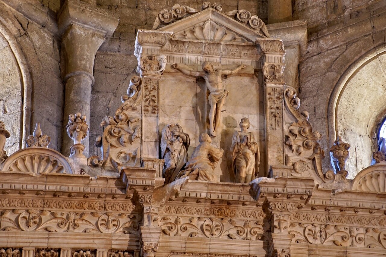 Le retable de l’église abbatiale de Poblet, construit en albâtre de Sarral et d’Ollers, a été commandé par l’abbé Pere Caixal au sculpteur Damià Forment le 2 avril 1527. En 1529, avant la date limite, il était déjà construit, comme indique l’inscription qu’on trouve encore aujourd’hui au sous-banc du retable.