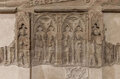 - Au cours de sa restauration, la figure du Pantocrator, qui avait été enlevée lors de l’abandon du monastère, a été restituée à l’ensemble. Cette figure, comme celles qui forment l’apostolat frontal et les sculptures des anges, peuvent être attribuables au maître anonyme d’Anglesola. En tout cas, c’est un bel ensemble de personnages souriants, dont la grande sérénité est exprimée par la délicatesse formelle.